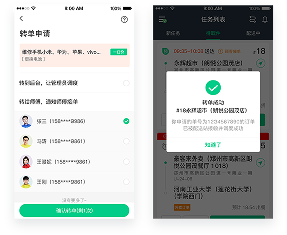 師傅接單后開始服務(wù)前如有突發(fā)狀況無法繼續(xù)完成服務(wù)時可自行發(fā)起線上轉(zhuǎn)單求助,師傅可自己指定其他師傅或者轉(zhuǎn)到調(diào)度中心由平臺重新指派師傅繼續(xù)完成服務(wù)