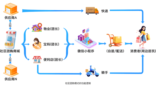社區(qū)團(tuán)購是以小區(qū)為單位,以微信為載體整合多個(gè)社區(qū)社群資源,為社區(qū)居民提供日常所需商品、生活服務(wù),集中化管理運(yùn)營的一種商業(yè)模式。