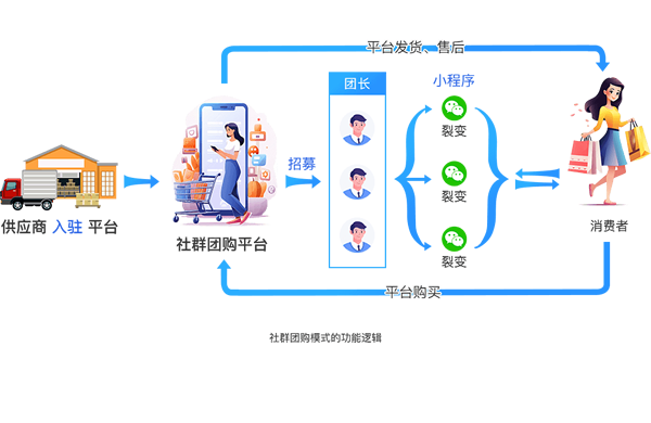 商家通過整合微信群資源以及社區(qū)團(tuán)購供應(yīng)鏈, 并通過群裂社群團(tuán)購主要是以微信為載體,整合微信群資源和上游供應(yīng)鏈資源,獲取更多利潤空間。