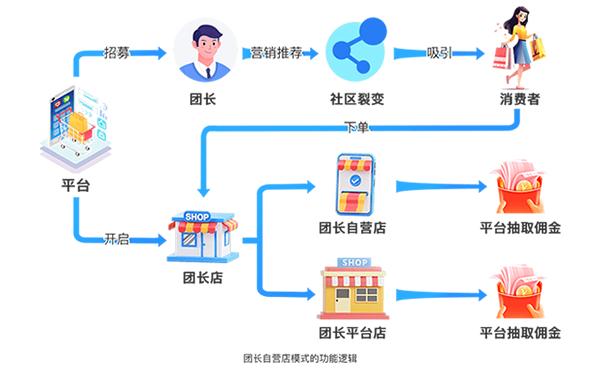 團(tuán)長(zhǎng)在線上團(tuán)長(zhǎng)店中售賣線下自營商品,豐富平臺(tái)商品組成,線下還能進(jìn)行智能收銀,提升團(tuán)長(zhǎng)賣貨效率的同時(shí)增強(qiáng)團(tuán)長(zhǎng)粘性,平臺(tái)抽取團(tuán)長(zhǎng)自營店提成,實(shí)現(xiàn)雙贏。
